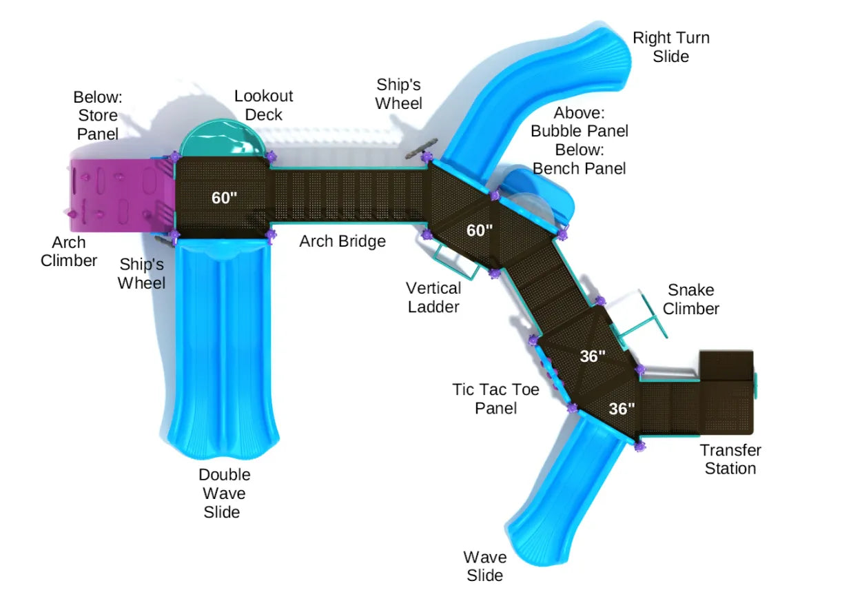Once on top, the fun continues with a range of thrilling slides, including the Right Turn Slide for a twisty descent, the Wave Slide for a bouncy ride, and the Double Slide for side-by-side racing with friends. For even more adventure, the Arch Bridge connects platforms, providing a fun space for children to run back and forth.