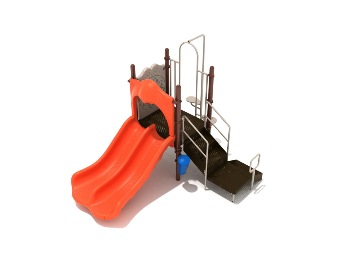 The Arlington Play Structure brings a variety of interactive and climbing features together in a smaller, easy-to-place design that supports active and imaginative play. Children can make their way to the top deck using the Pea Pod Climber, which features wide, stable platforms that allow users to choose their steps as they ascend. From the elevated area, the Double Slide offers two parallel sliding lanes for shared fun and quick descents back to the ground. At the base of the structure, the Single Drum introduces hands-on musical play, while the Maze Panel provides an engaging activity that encourages exploration and interactive movement. Compact yet full of play value, this structure stands out for its blend of a stable Pea Pod Climber, dual slide design, and creative activity panels in a space-efficient layout.