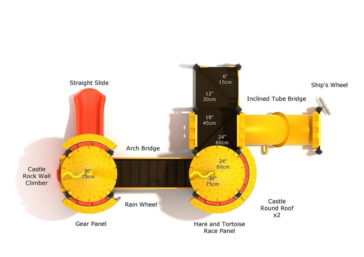 For an extra dose of fun, an Arch Bridge connects different sections of the Arrow Loop Archer, offering a playful crossing experience. Down below, the playset features engaging panels like the Ship's Wheel and Rain Wheel, ensuring that kids on the ground are also entertained.