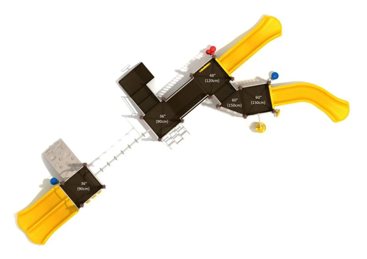 The Bandera Play Set is the perfect playground for kids who crave both mental stimulation and physical challenges, offering a versatile layout packed with fun features that keep children engaged for hours. The smaller structure introduces young climbers to adventure with the Sea Creature Climber, featuring 3D animal grips, and a low Climbing Wall that builds confidence before they zoom down the Double Slide for a thrilling descent. To reach the larger structure, kids must conquer the Straight Swinging Ring Ladder, testing their strength and coordination as they swing from ring to ring. At the top, they’ll discover even more excitement, choosing between the Wave Slide for an exhilarating ride or the Right Turn Slide for a twisty descent. For a different route upward, the Pod Climber offers a fun and challenging alternative. Once on the upper platform, kids can explore the Gear Panel, encouraging creativity and problem-solving, while the Metal Barrier with Ship’s Wheel invites imaginative play as they steer their “ship” across the high seas. Blending physical activity, cognitive engagement, and imaginative play, the Bandera Play Set is an ideal addition to any playground ready to inspire young adventurers.