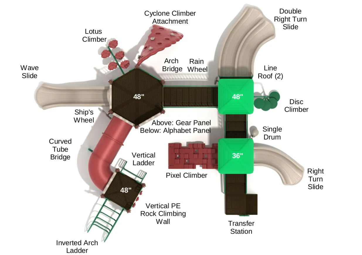 From the central hexagon deck, kids have multiple paths to explore. They can crawl through the Curved Tube Bridge, test their coordination on the Inverted Arch Ladder, or cross the Arch Bridge to find the Double Right Turn Slide and Single Right Turn Slide, offering plenty of thrilling ways to descend back to the ground.