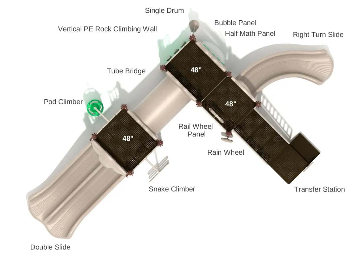 PE Rock Wall: For those seeking an extra challenge, the PE Rock Wall provides a thrilling way to ascend back to the platform, giving kids an opportunity to build their climbing skills.