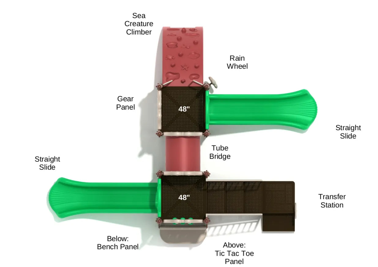 For a more physically challenging climb, the Sea Creature Climber is an exciting way to scale the Berkeley play structure. Children will use turtles and jellyfish to help them navigate the curves, giving them an engaging way to improve their balance, grip, and climbing abilities.