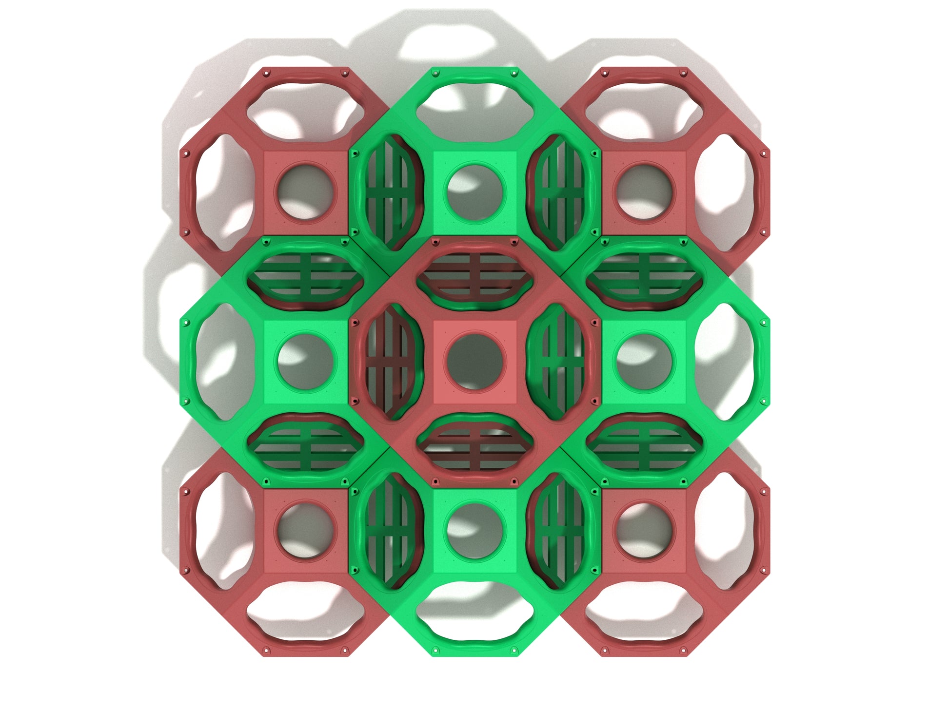 At first glance, the Blackwell Berm stands out with its striking cluster of geometric pods. These interconnected polyhedral shapes form an engaging climbing environment where children can scale, balance, and navigate their way through the structure. The vibrant, contemporary color palette adds visual energy to the playground, making the unit an eye-catching centerpiece that instantly draws kids in.