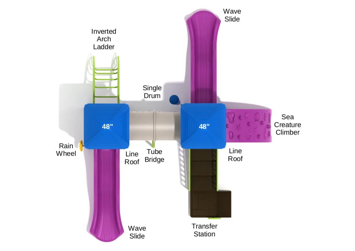Connecting the two towers is a Tube Bridge, giving kids the opportunity to crawl between the platforms and enjoy a little mid-air adventure. It’s a fun, challenging way to get from one side to the other!