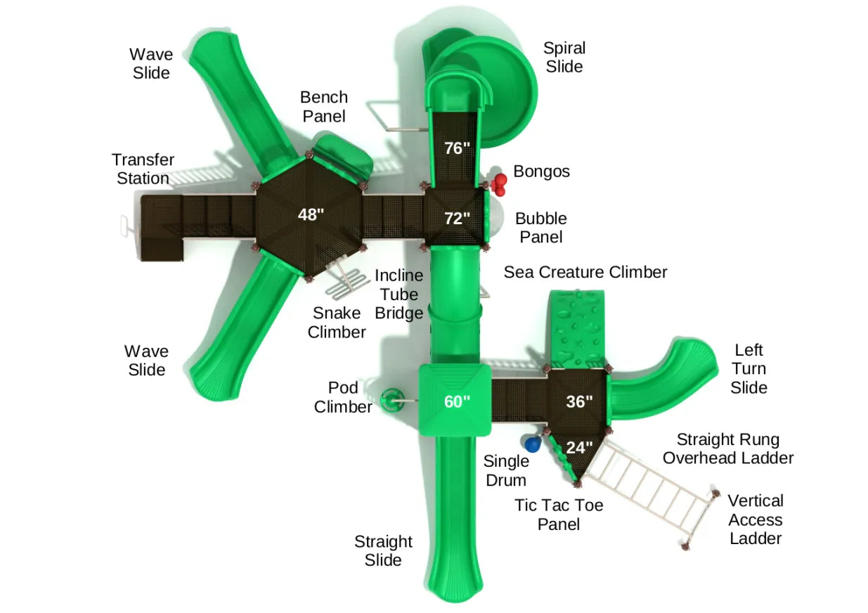 Once they’ve made it to the top, the fun continues with five exciting slides: two Wave Slides and a Spiral Slide that promise thrilling rides for every child. An Incline Tube Bridge connects the platforms, adding an extra layer of fun as kids crawl through it. And for a unique way to look out over the playground, the Bubble Panel offers a fun viewing experience across the play area.