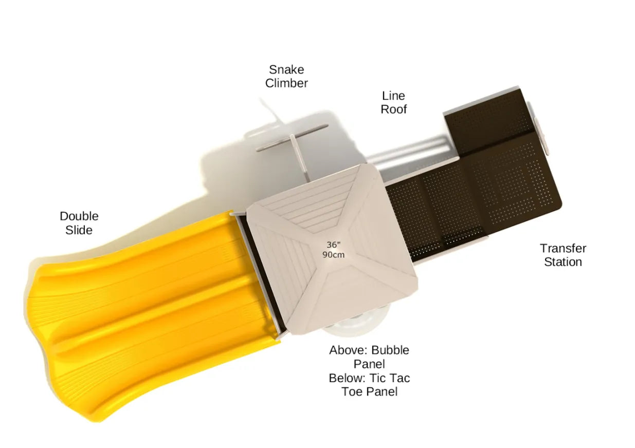 On the ground level, children can engage in a classic game of strategy on the Tic Tac Toe Panel, fostering friendly competition and helping them develop important social skills. And for kids who love the thrill of sliding, the Double Slide is sure to excite as they race down, deciding which slide to take first for double the fun!