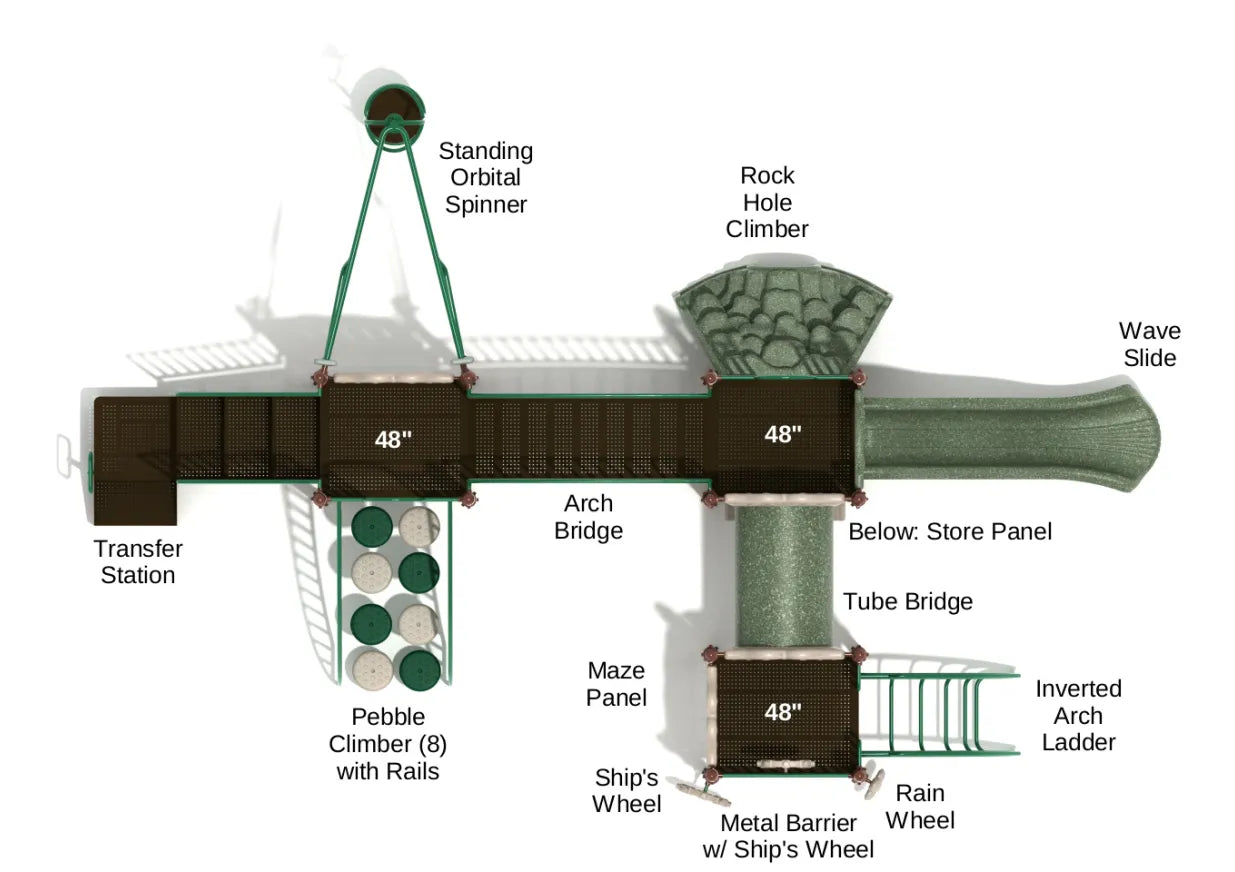 Metal Barrier with Ship’s Wheel: Positioned on the lookout deck, this ship’s wheel is perfect for the captain to steer their imagination. A second wheel below allows the first mate to join in, making every play session an adventure—whether sailing down a river, crossing the seas, or journeying into space!