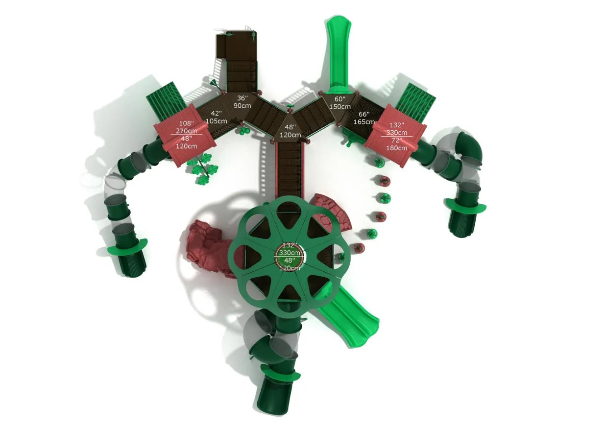Bridges and climbing elements are thoughtfully woven throughout, encouraging physical development, coordination, and teamwork through interactive, cooperative play. Styled with earthy tones and organic textures, Hanging Garden Heights evokes a whimsical treehouse feel, making it a perfect fit for parks, schools, or community spaces.