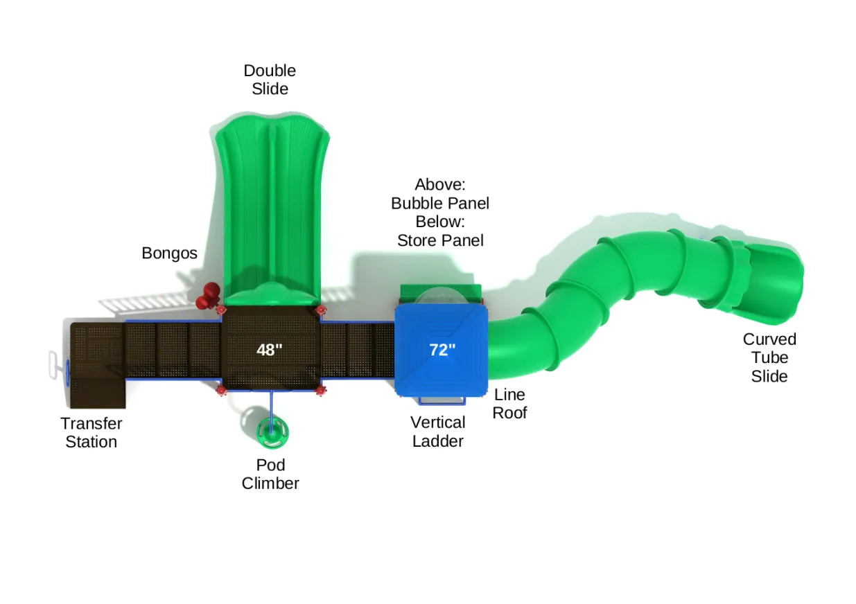 Line Roof: Provides shade and protection from the elements while kids play on the higher platforms.