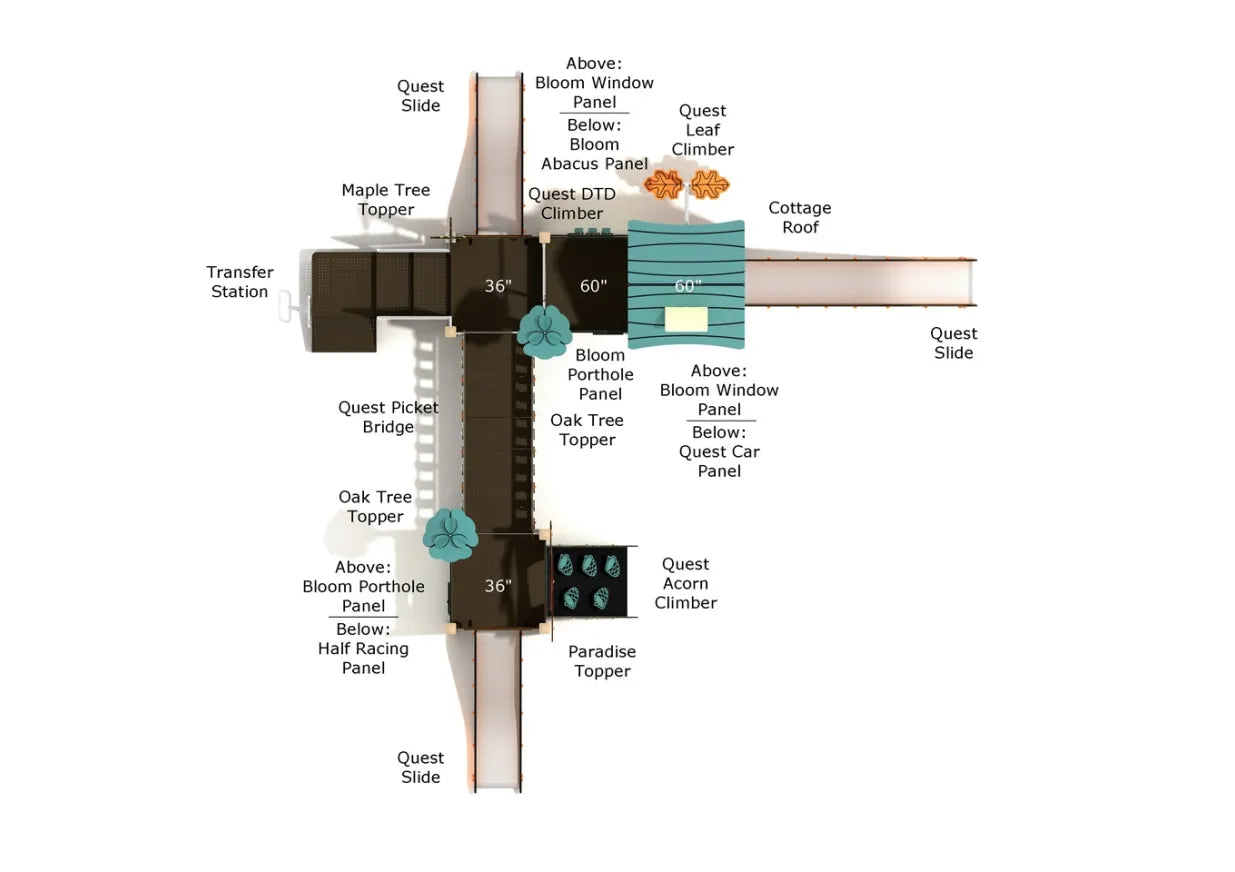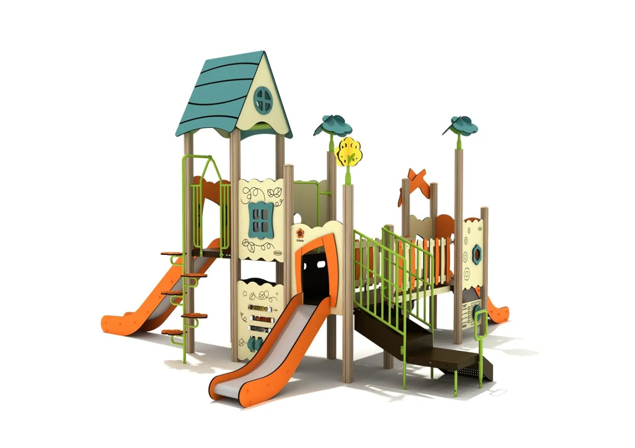 Children will delight in racing down the dual wave slides, crawling through the whimsical bridge tunnel, and scaling the climbing ramp adorned with floral details. The house-style rooftops, peek-a-boo windows, and cozy tower spaces add architectural charm and inspire creative roleplay, making every corner of Iron Oak an invitation to explore.