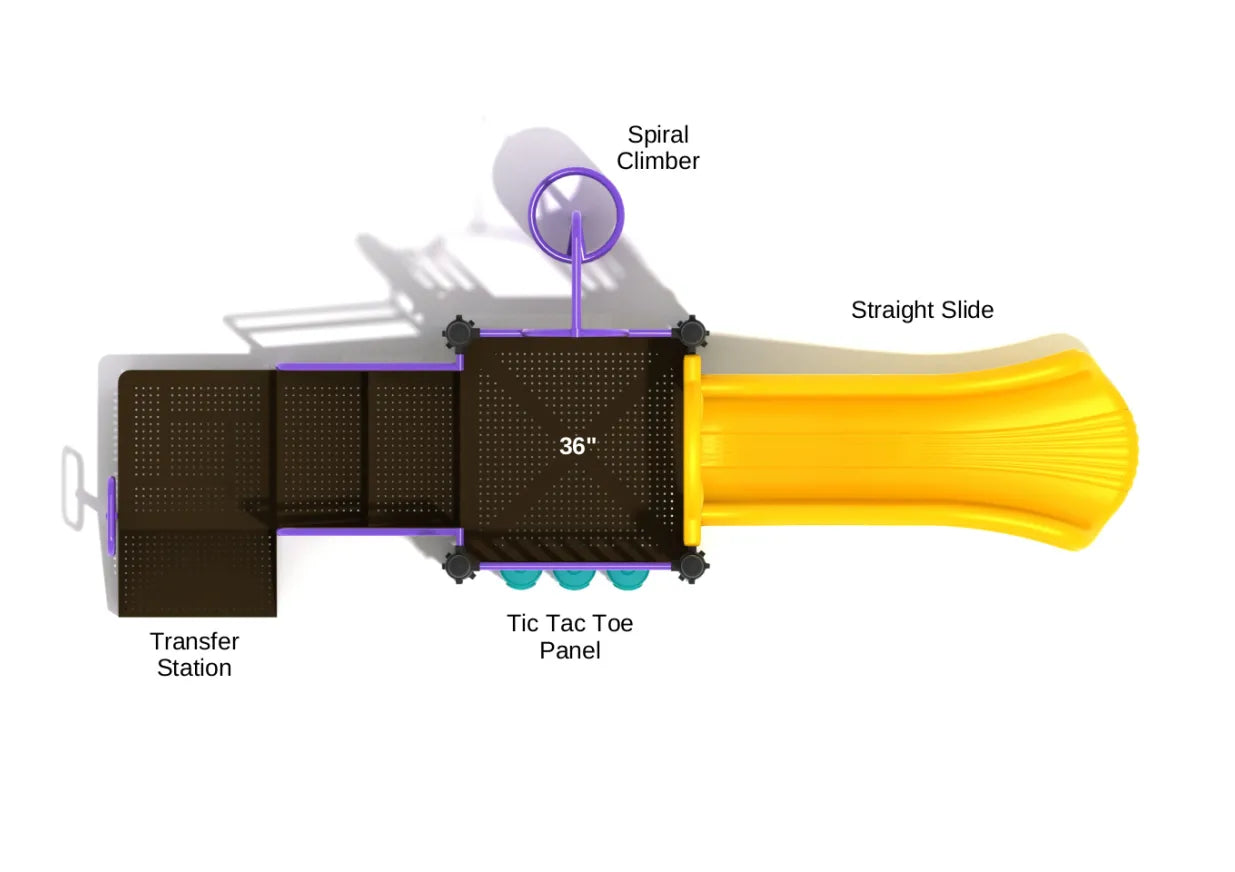 The Transfer Station provides the easiest access to the deck, allowing even the youngest children to get involved with ease. For those feeling a bit more daring, the Spiral Climber offers a fun challenge, encouraging balance and strength as kids twist their way to the top.