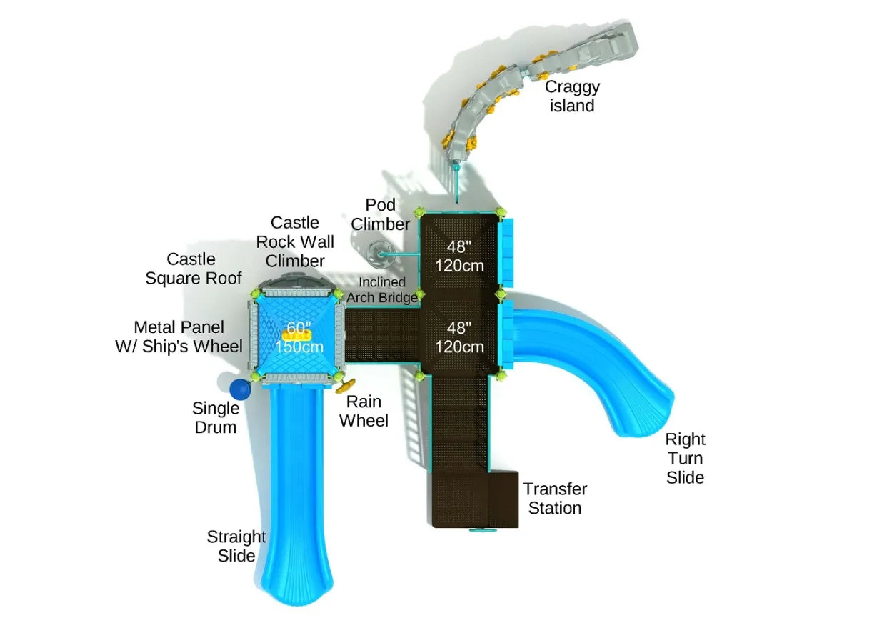 Once at the top, kids are met with a trio of fun activities. They can take the helm of the Ship’s Wheel and steer their imaginary ship on grand adventures. For a thrilling descent, they can choose between the Right Turn Slide or the Straight Slide for a quick and exciting ride down. If they feel like making some music, the Single Drum and Rain Wheel are great ways to tap into their creativity and add some rhythm to their playtime.