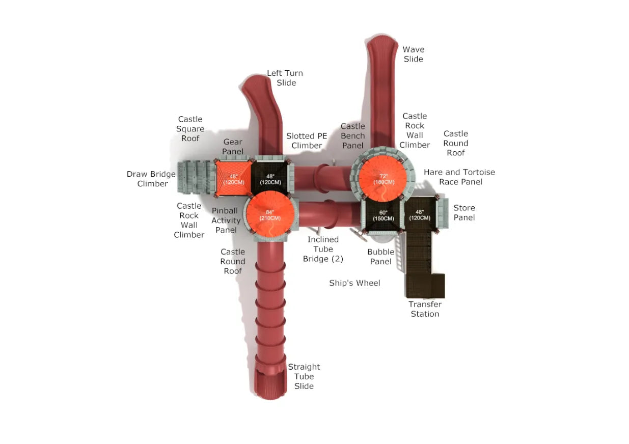 At the top, the elevated platform becomes a hub of excitement, packed with interactive panels that keep kids engaged and exploring. The real thrill begins when it’s time to descend: