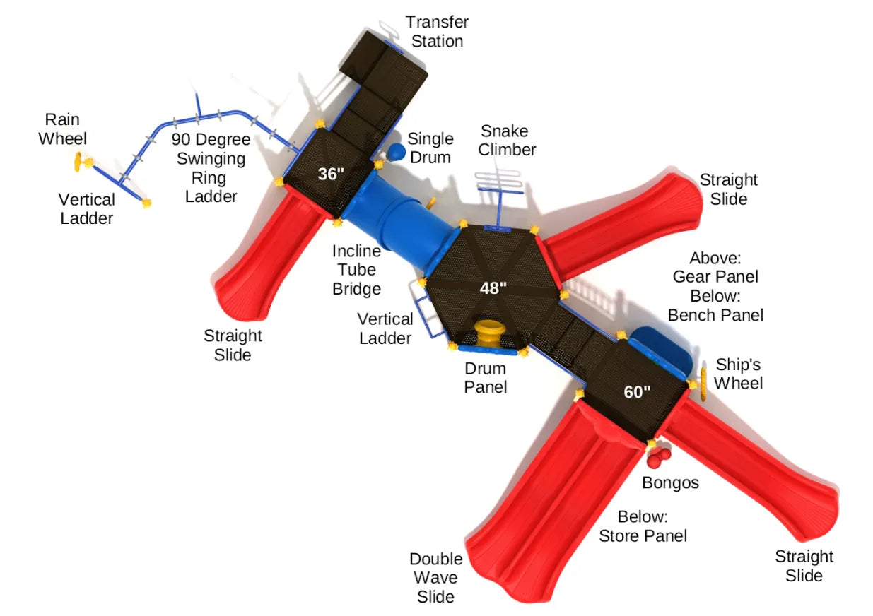 With three Straight Slides and a Double Wave Slide spread across multiple levels, kids can enjoy exciting races and fast descents. Whether they're sliding down in pairs or going solo, the Mountain View offers endless fun and variety in its sliding options. For younger children, the ground level provides a range of features to keep them engaged without needing to climb, including Bongos, a Single Drum, a Ship’s Wheel for imaginative play, and a Rain Wheel that creates the soothing sound of rainfall when spun. The Bench Panel offers a quiet spot for conversations or a break from all the activity.