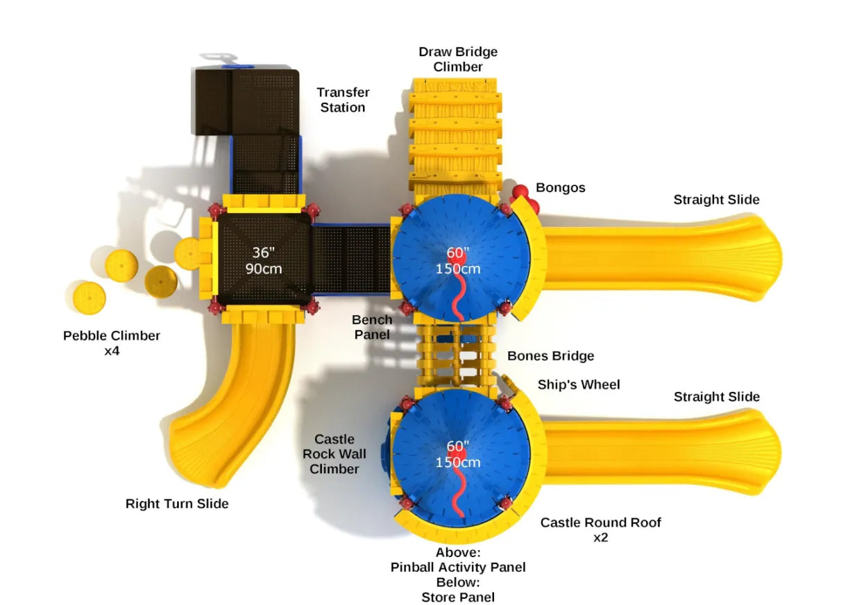 Once atop the playset, kids can take a moment to socialize while playing with the Pinball on the upper deck. Down at ground level, there’s plenty of entertainment to keep the fun going. The Bongos, Ship’s Wheel, and Store Panel offer interactive opportunities, while the Bench Panel provides a spot to rest after all the excitement.