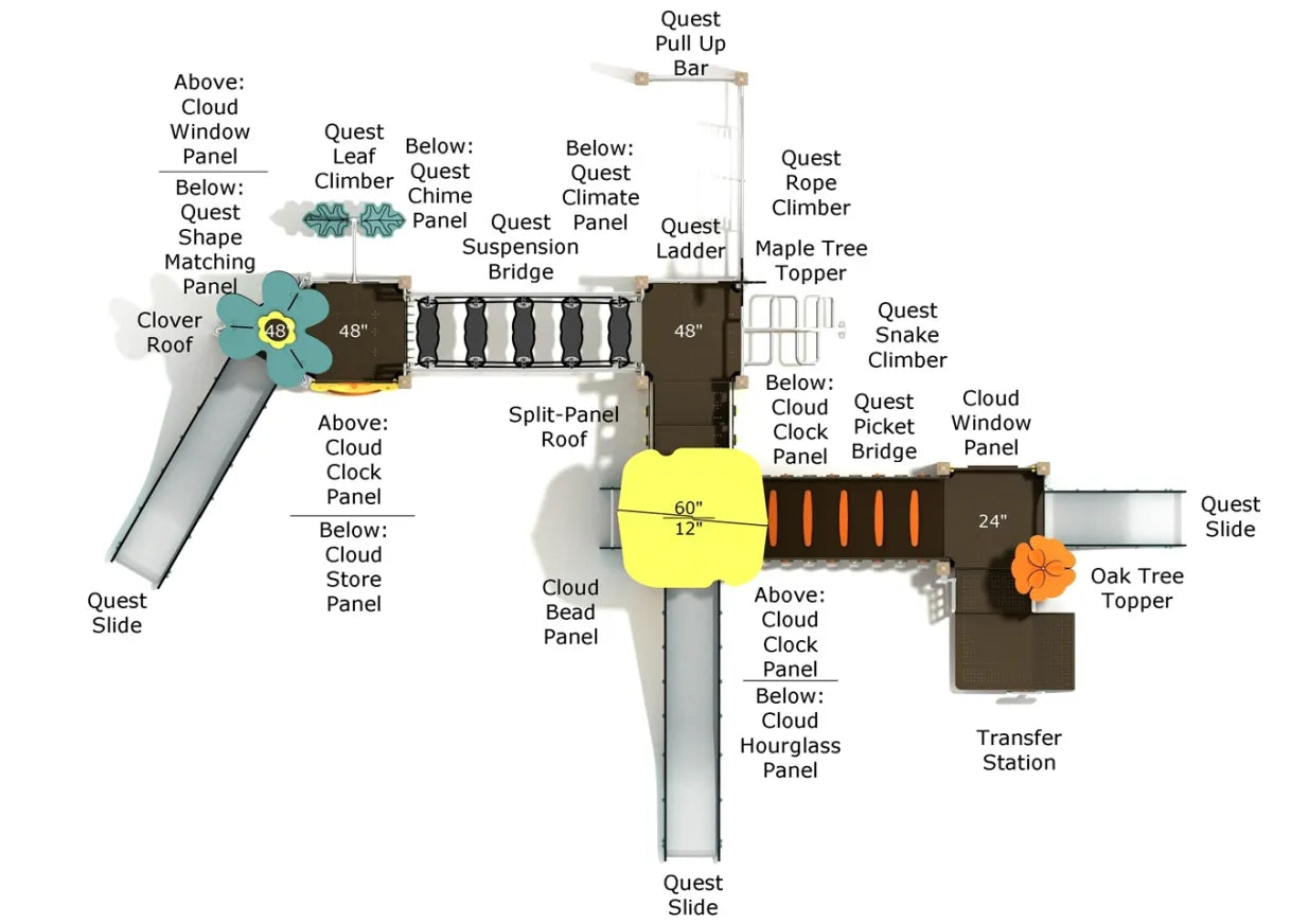 In the heart of the structure, kids will discover interactive panels like the Cloud Clock, Shape Matching, and Chime Panel, offering inclusive, sensory-rich experiences that support cognitive development and cooperative play. From solo exploration to group adventures, Pecan Hickory meets every child where they are—providing fun, learning, and inclusivity in one cohesive design.