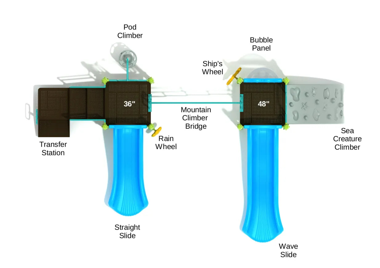 Once on the deck, kids can enjoy the Straight Slide from the Transfer Station side. For even more fun, the Wave Slide and Bubble Panel are located on the Sea Creature Climber side, providing additional excitement and sensory stimulation.