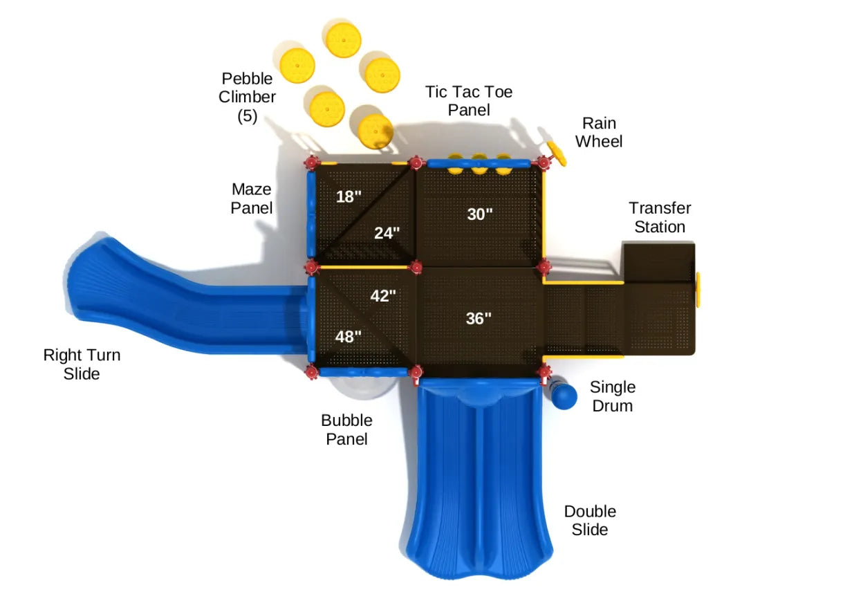 The adventure continues with the Pebble Climber, which provides a physical challenge to strengthen young muscles and improve their motor skills. The spacious square deck area ensures kids have plenty of room to move around safely and without bumping into one another, allowing for an interactive and engaging play experience.