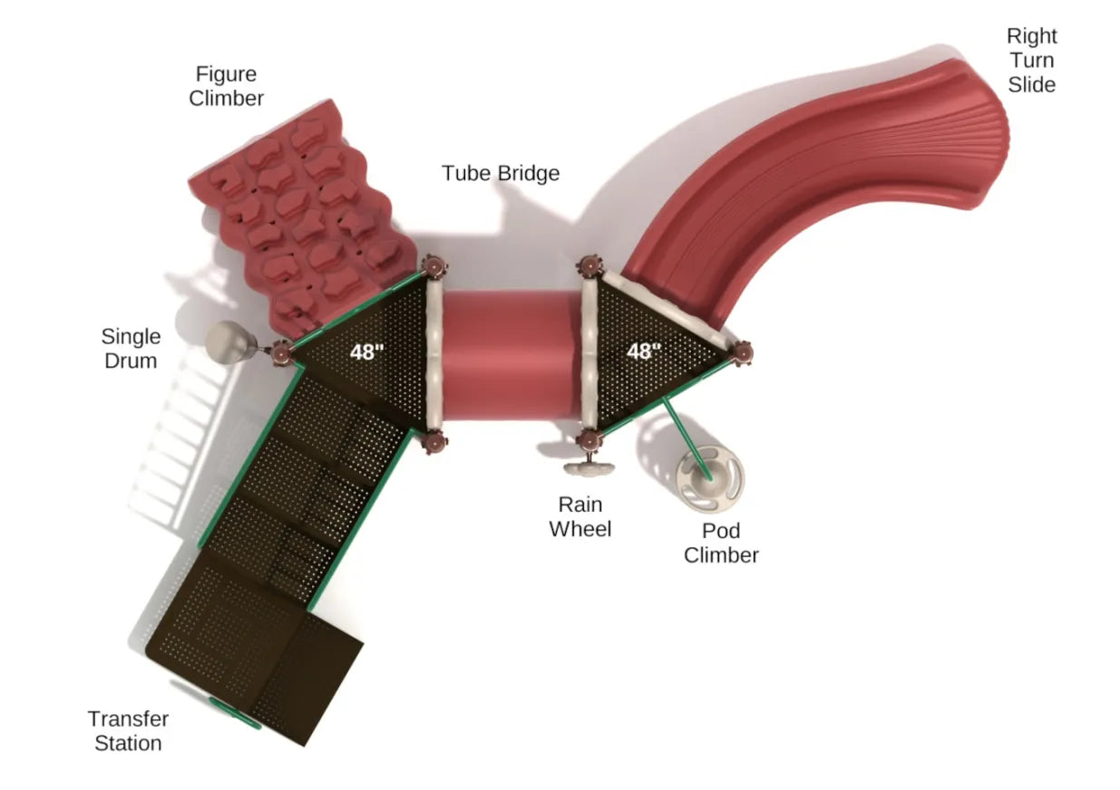 Starting at the Transfer Station entrance, children can enter the play system by crawling or running through the covered Tube Bridge, adding an element of surprise and excitement as they twist and turn. From there, they can race down the Right Turn Slide, an exhilarating ride that lets them speed down to the ground below.