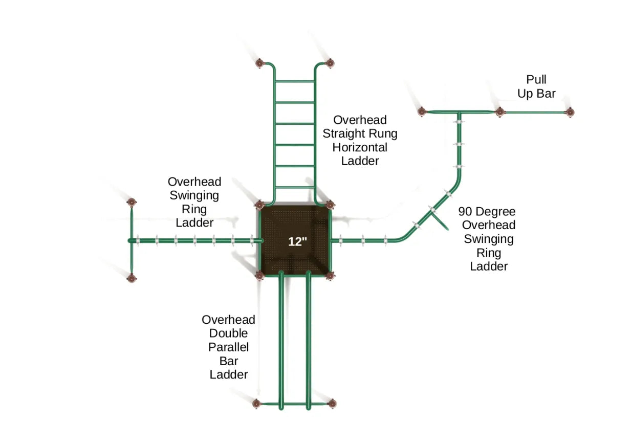 Overhead Swinging Ring Ladder: A seven-ring ladder for beginners, with the option to graduate to the nine-ring, 90-degree version for a more advanced experience.