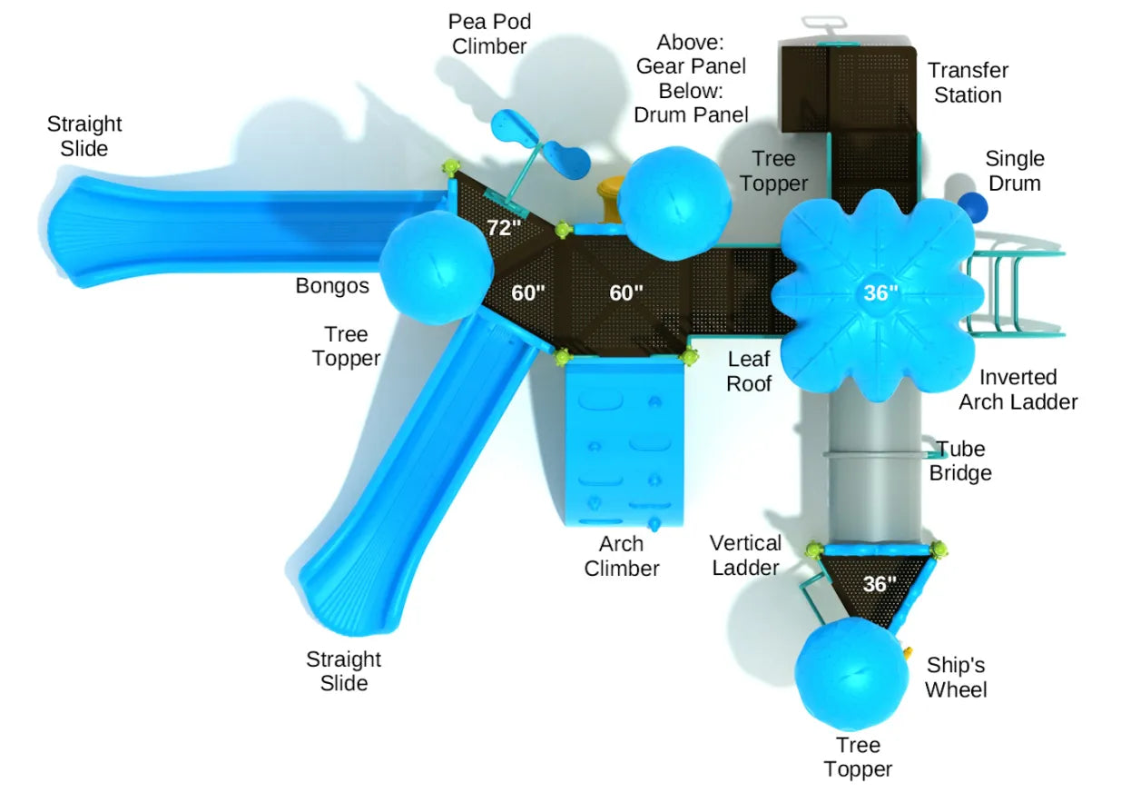 Tube Bridge: A creative and exciting passageway that connects two parts of the play structure.