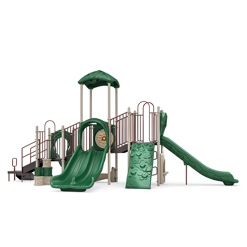 Get out and explore with the Shady Pines Playground, where the fun never ends! This amazing playground structure is packed with awesome play features that will keep kids entertained until the sun goes down. With a double slide and two single slides, kids can race to the bottom in style. The wing climber and rock climber offer challenging and exciting ways for kids to reach new heights, and the trunk climber provides a fun and interactive element for more exploration. The world map panel is an educational element that kids can use to learn about the world around them, and the counter panel allows kids to practice their counting skills. The rain wheel adds a touch of whimsy to the playground, and with so much to discover and explore, the Shady Pines Playground is the perfect place for kids to let their imaginations run wild. All this makes the Shady Pines Playground a great destination for kids' of all ages.