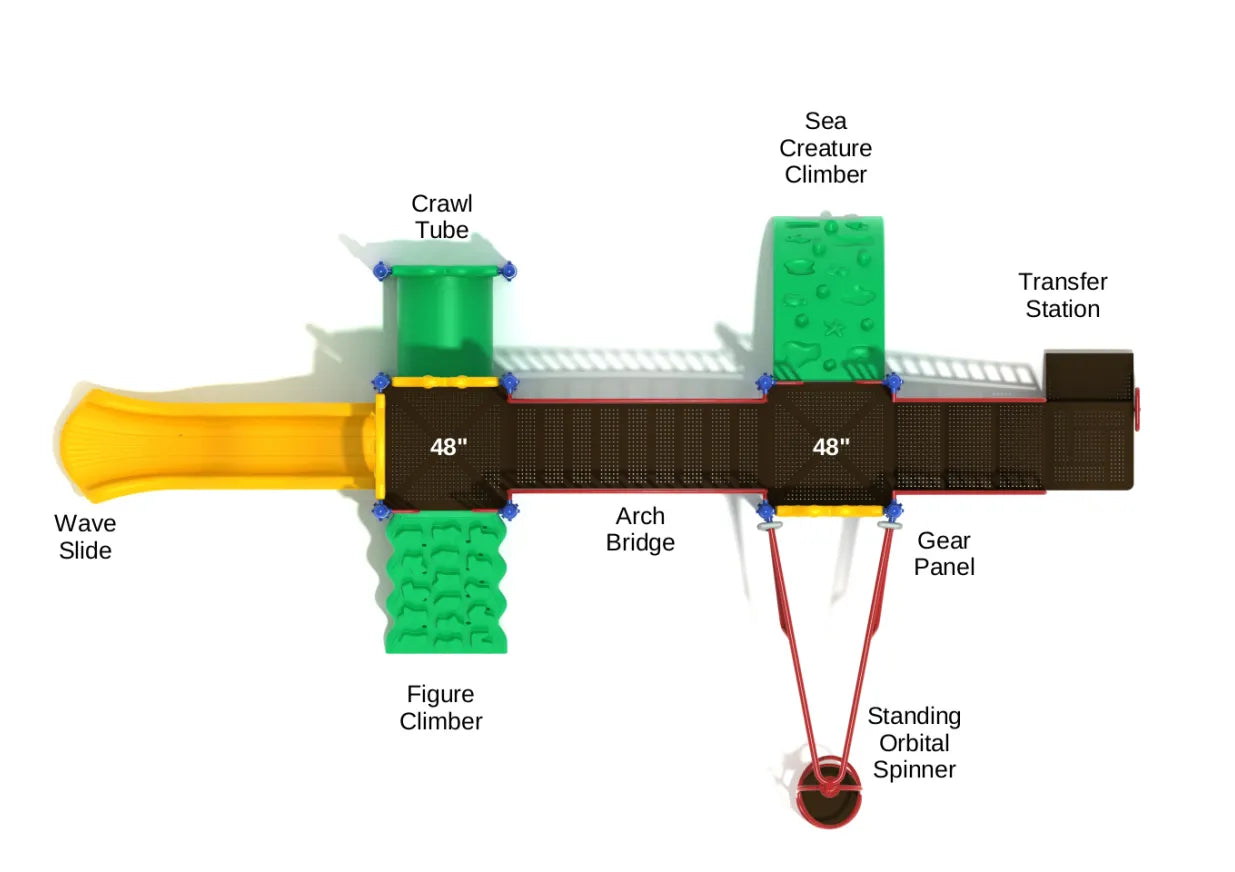 At the heart of the playset are exciting attractions like the Wave Slide and Figure Climber, both of which connect to a central platform, offering thrilling experiences for kids of different ages. For those looking to challenge their climbing skills further, the Sea Creature Climber provides a whimsical oceanic adventure, while the Orbital Spinner encourages balance and coordination.