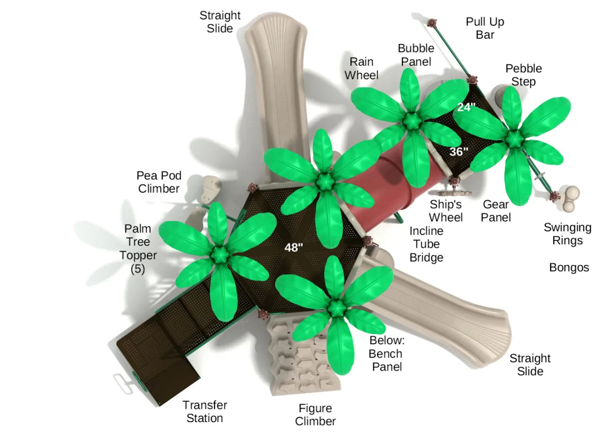 Palm Tree Toppers: Gorgeous tropical accents that provide shade and create an immersive play environment.