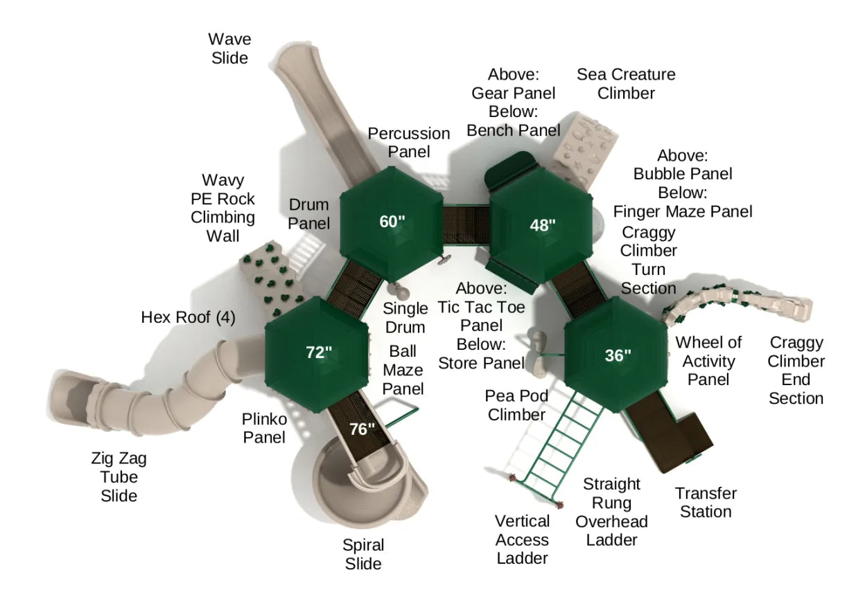 The Turpin Hills Play System is the ultimate playground experience, featuring four dynamic hexagonal platforms with matching Hex Roofs, offering hours of fun and exploration for children of all ages. With a combination of physical challenges, interactive play, and creative features, this play system is designed to engage kids in exciting, multi-sensory activities.
